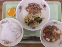 ★今日の給食ごはん肉豆腐豆黒糖野菜のおかか和えきよみ牛乳★一口メモ今日から給食が...