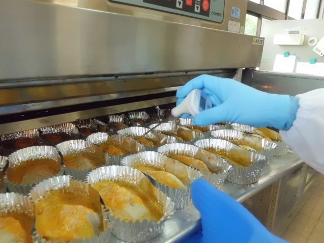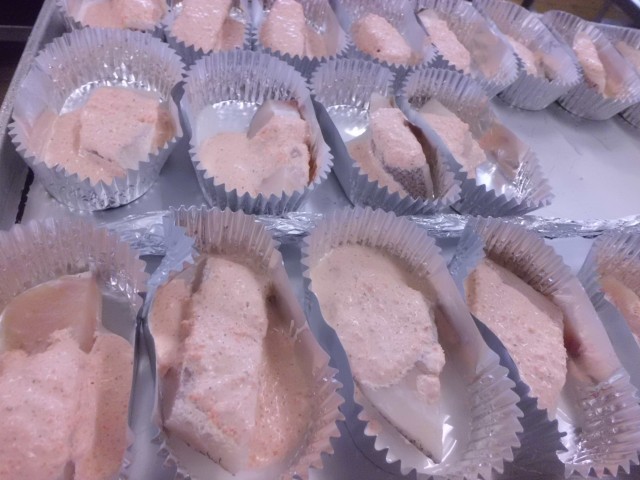 すりおろした人参とマヨネーズを混ぜて魚に夕焼け色のソースをかけて焼いてあります。