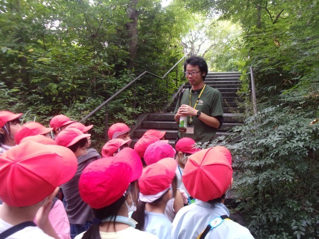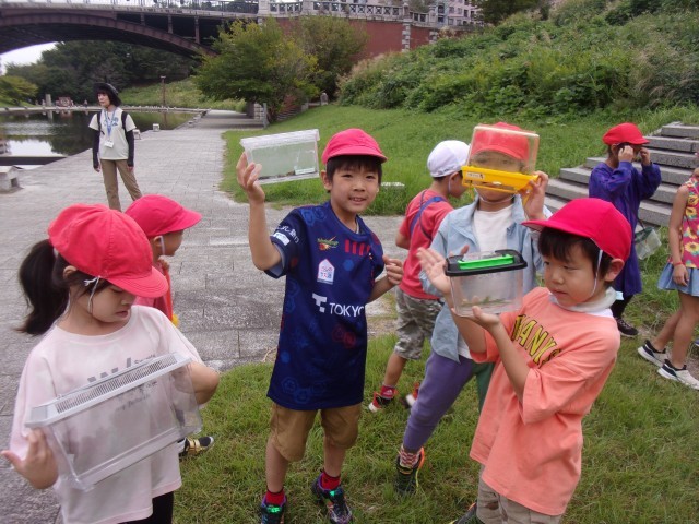 自然館の「虫の先生」から、虫についての話を聞いた後に、実際に公園の中で虫を探しました。コオロギやバッタなど、たくさんの虫を見つけることができ、笑顔で活動していました。
