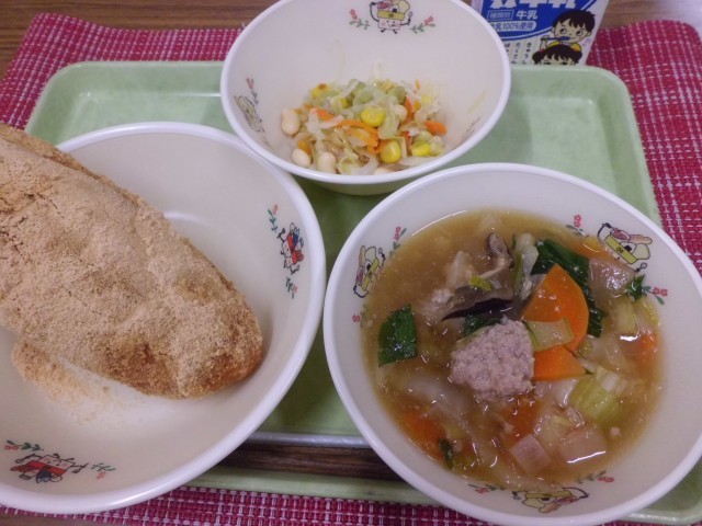 肉だんごスープは、野菜たっぷりスープに手作りの肉だんごを丸めて落としていきます。手間は、かかりますが、旨味がつまったスープです。春雨も入っているので食べ応えもあり児童に人気です。