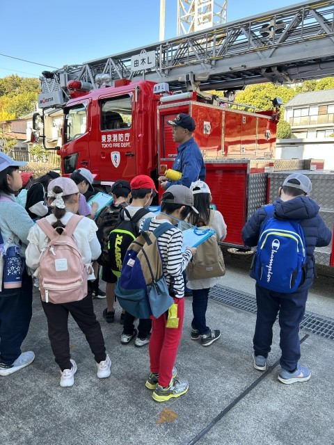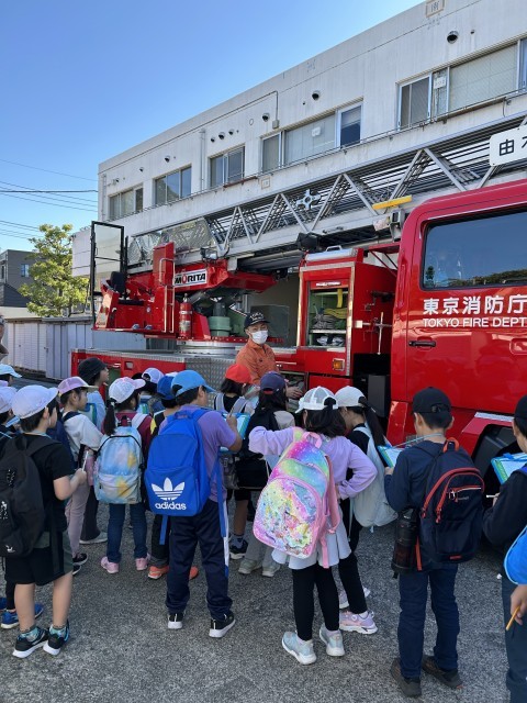 大きな「はしご車」を見せてもらいました。はしごは30メートルまで伸びるそうです。消防車には、いろいろな秘密があるようです。