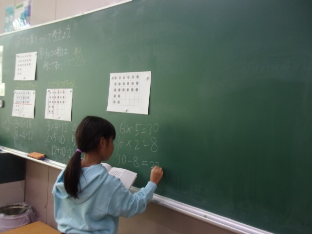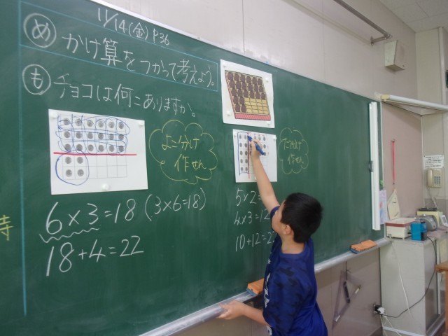今日は、L字型に並んだチョコレートの数をかけ算を使って求める学習をしました。同じ数のまとまりになるように縦や横に分けて考えたり、チョコレートが全部あったと考え、ない部分をひき算して考えたり、いくつもの考えを出し合いました。自分の考えと友達の考えの似ているところや違うところに着目しながら、お互いの考えを聞き合うことができました。