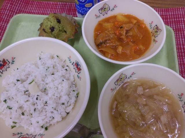 今年最後の給食は、クリスマス献立です。チキン料理とカップケーキを作りました。
