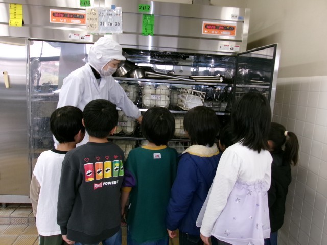 調理員さんが説明しながら中を案内してくださいました。100人分のご飯が炊ける釜や300枚の魚が焼けるオーブンなど、大きな調理器具を見て、驚いていました。