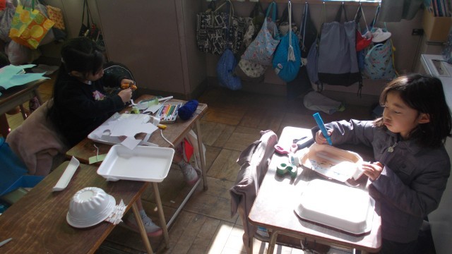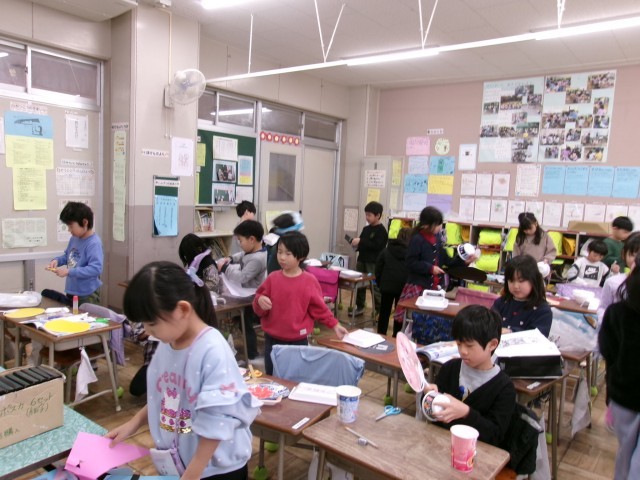 今週の図工で「ふわっふわっゴー」という学習をしました。スチレン容器を風が入るように切ったり、ペンや色画用紙で工夫して飾ったりして作品を作りました。