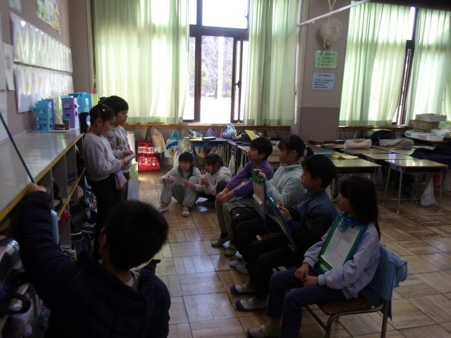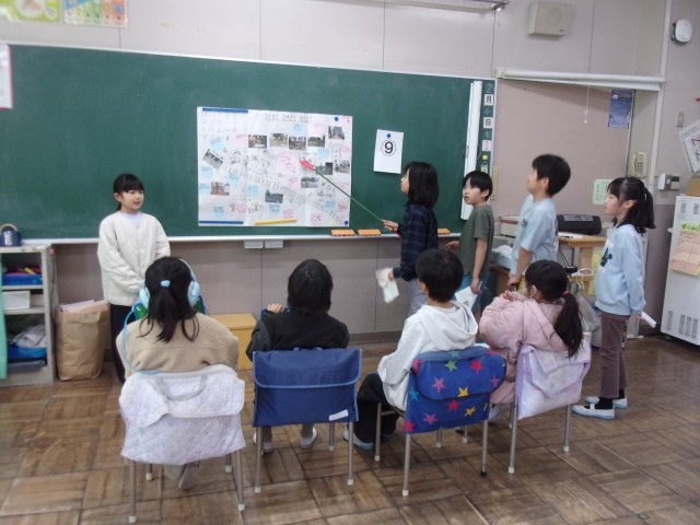 学級活動の時間に、3年生の作った「地域安全マップ」を使って、3年生から地域の安全について伝えてもらう学習をしました。「地域安全マップ」とは、3年生が総合的な学習の時間に、「安全な場所=入りやすく見えやすい場所」「危険な場所=入りやすく見えにくい場所」をキーワードにして学区域の様子をまとめたものです。2年生は班ごとのグループに分かれ、3年生の発表のコーナーをまわって説明を聞きました。2年生の子供たちは、学習を通して、「これからは一人ではなく、何人かで行動したい。」「地域に危険な場所があると分かったので、気を付けていきたい。」という感想をもち、一人一人が防犯意識を高めていました。
