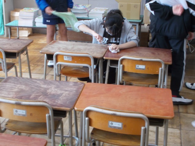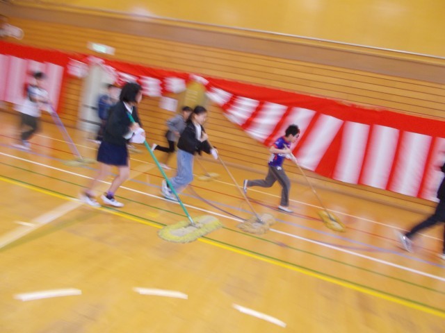1年生が希望をもって入学できるように床を磨きます。