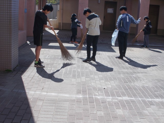 正門からの通路も掃いてきれいにします。