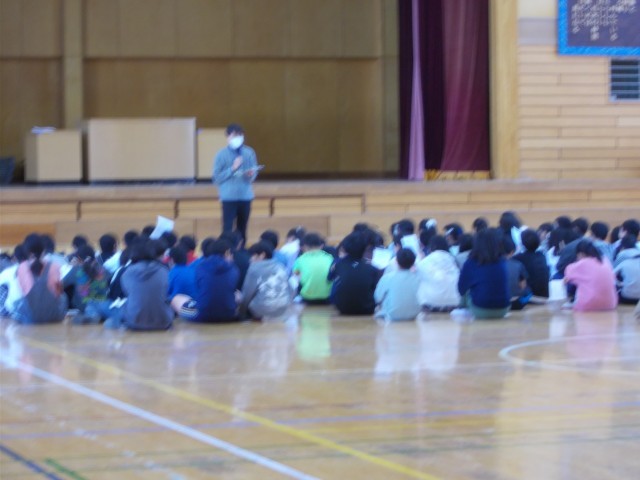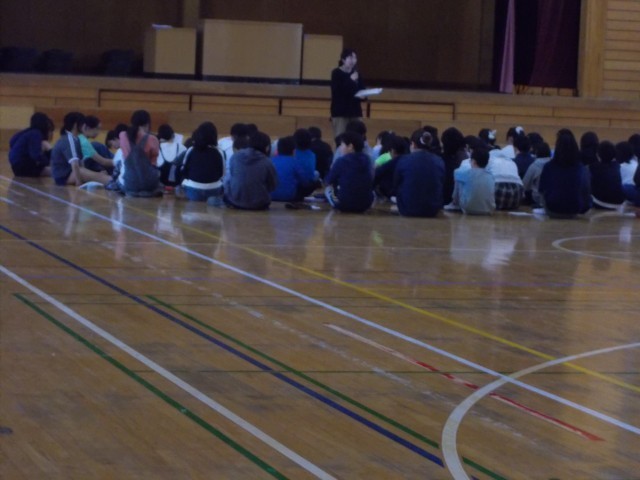 体育館整備の奉仕活動の後の学年集会です。
