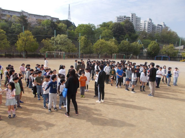 さわやかな朝、1年生も参加して、令和8年度最初の全校朝会です。
