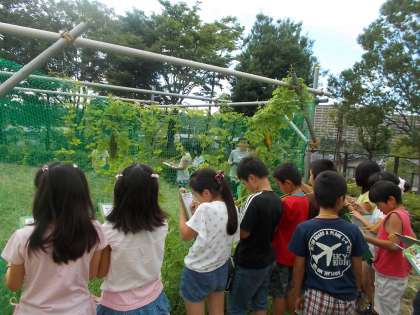 9月4日(木)理科でツルレイシの観察をしました。太陽の光をたくさん浴び、ぐんぐん成長しました。葉が茂って大きな実がなり、子どもたちは大喜びでした。まだ小さい実を見て、「しぼんだ花が先にくっついている!」「最初はこんなに小さいんだね!」などと言っていました。