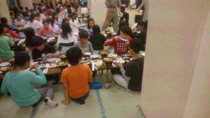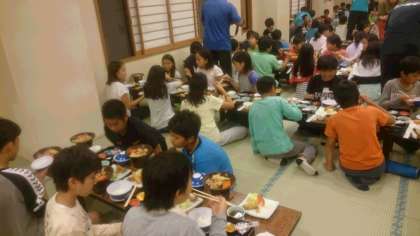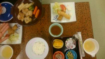夕食タイム。たくさん歩いたので、お腹ペコペコです。いただきまーす。