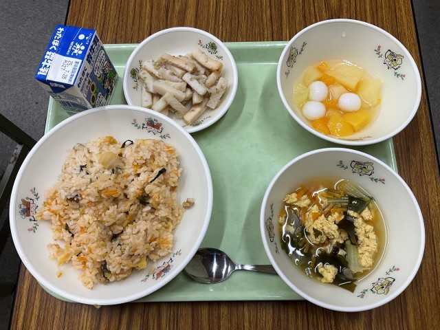 キムチチャーハン、いかのネギ塩炒め、卵の中華スープ、フルーツ白玉、牛乳 です。