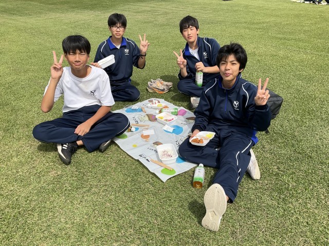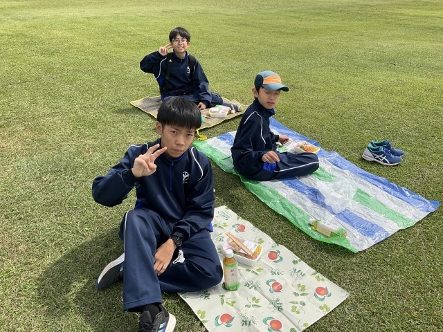 昼食が終わって、芝生で遊んでいます。