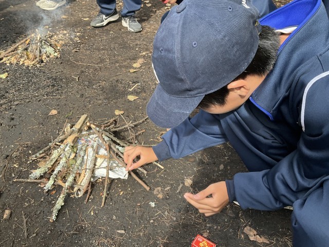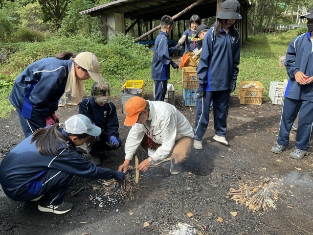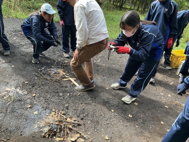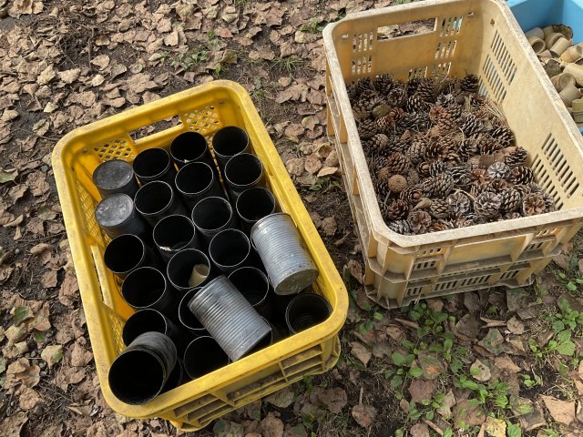 空き缶と松ぼっくりや竹で炭を作る体験をします。