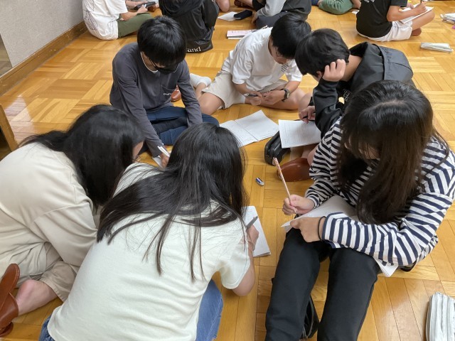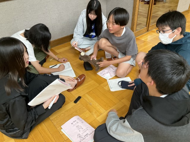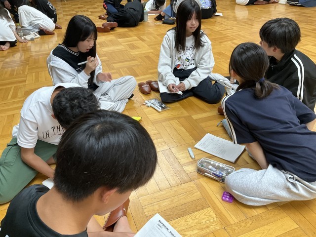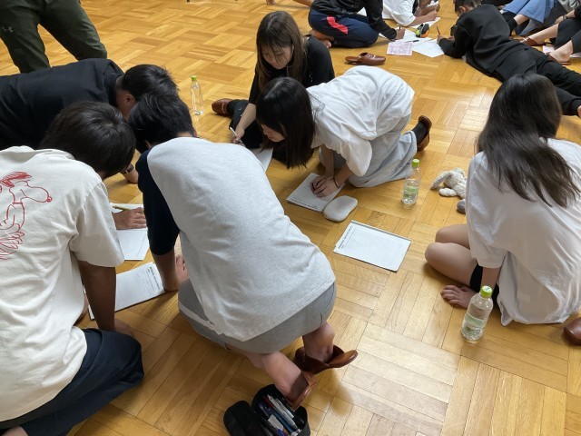大広間に集まって学習のまとめをしています。