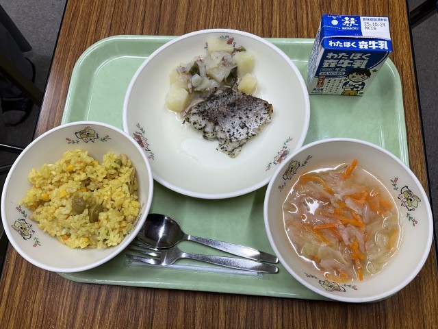 白身魚のハーブ焼き、ジャーマンポテト、ジュリエンヌスープ、カレーピラフ、牛乳 です。