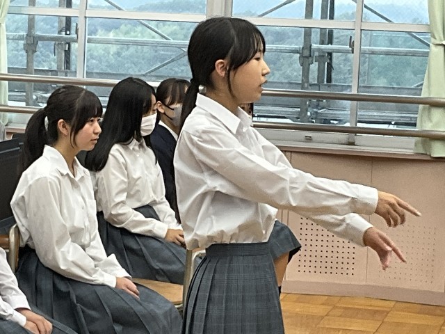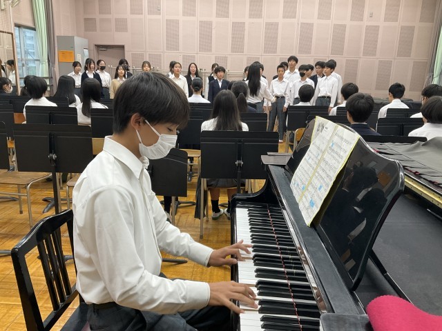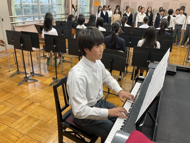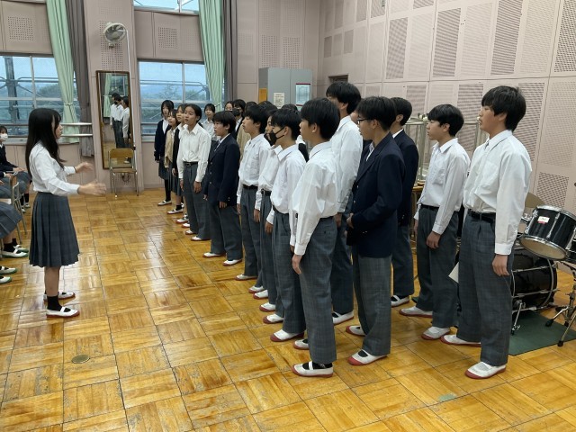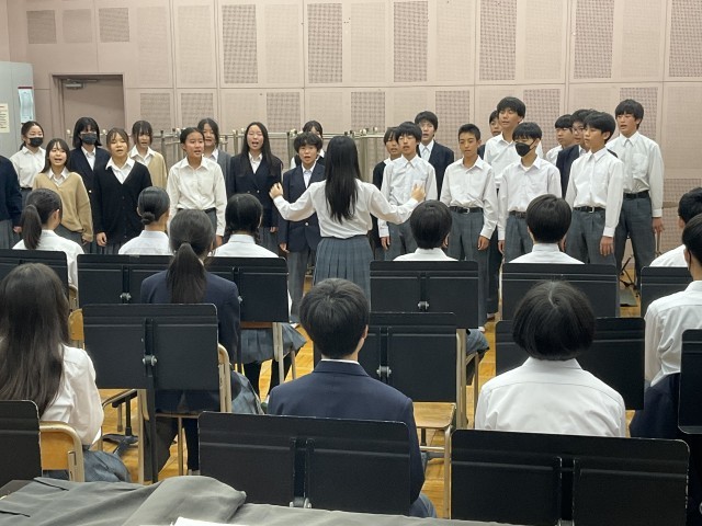 上級生の前で歌っています。