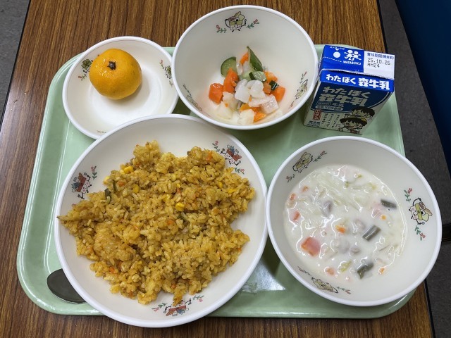 メキシカンライス、キャベツのクリーム煮、コロコロサラダ、みかん、牛乳 です。