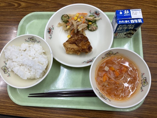 鳥の唐揚げ甘ダレかけ、ツナと大根のサラダ、ABCスープ、ごはん、牛乳 です。