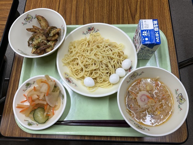 みそラーメン風つけめん、うずらの卵、のり塩ポテト、野菜の南蛮漬け、牛乳 です。