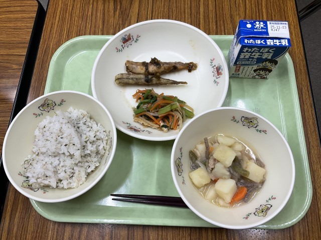 にぎすの南蛮漬け、塩肉じゃが、野菜の彩り和え、八王子産大根の菜飯、牛乳 です。