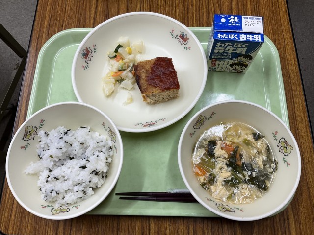 豆腐ハンバーグ、ポテトサラダ、たまごスープ、わかめごはん、牛乳 です。