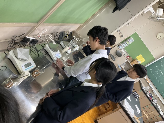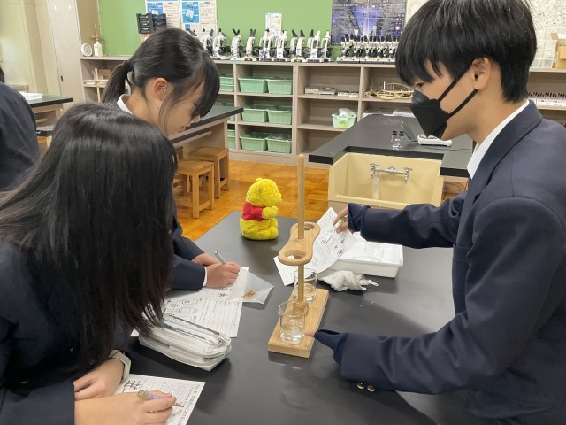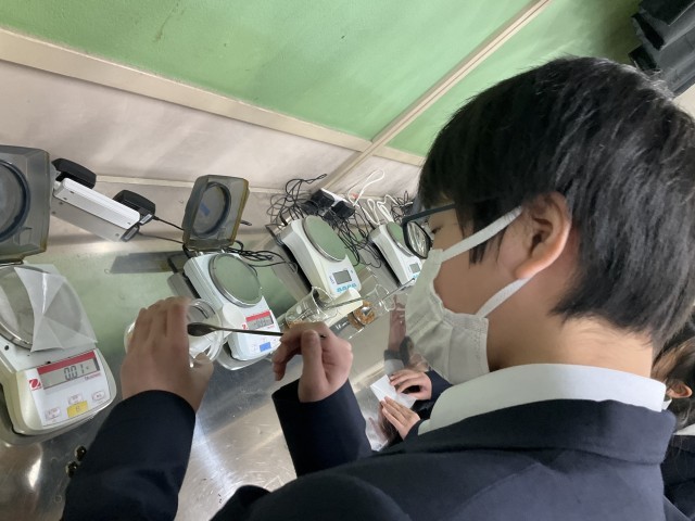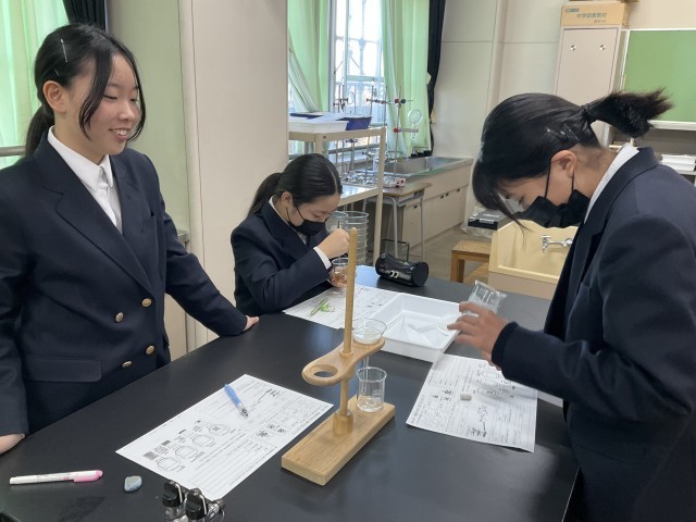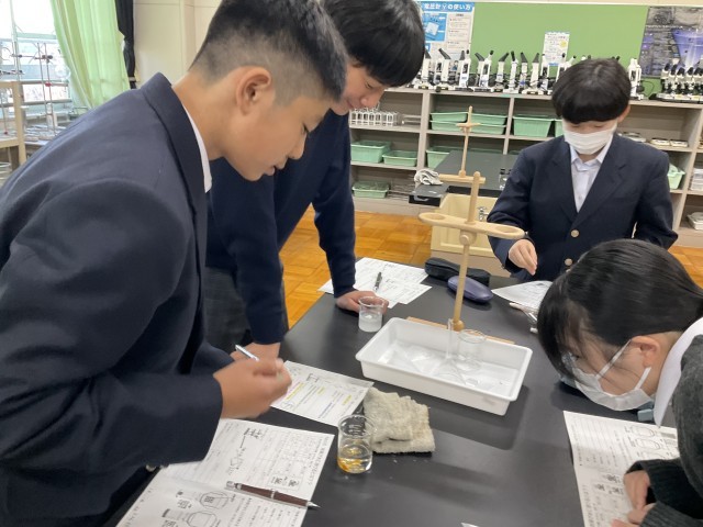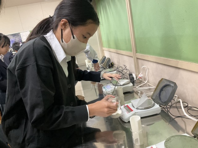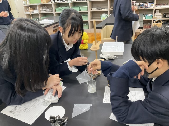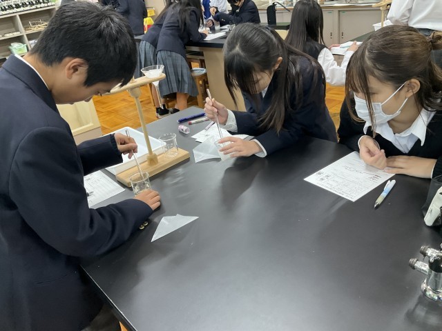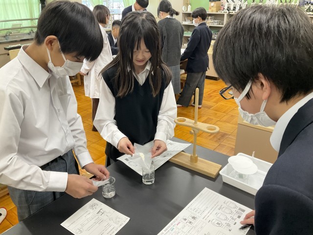 物質が水に溶けることについて実験しています。