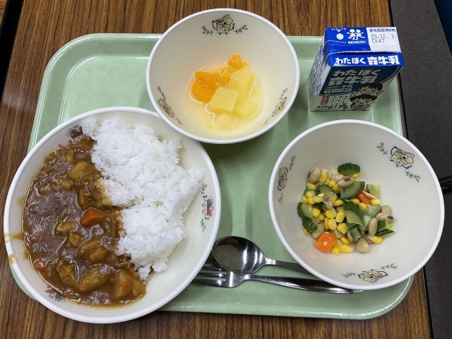 ポークカレー、ビーンズサラダ、アップルポンチ、牛乳 です。