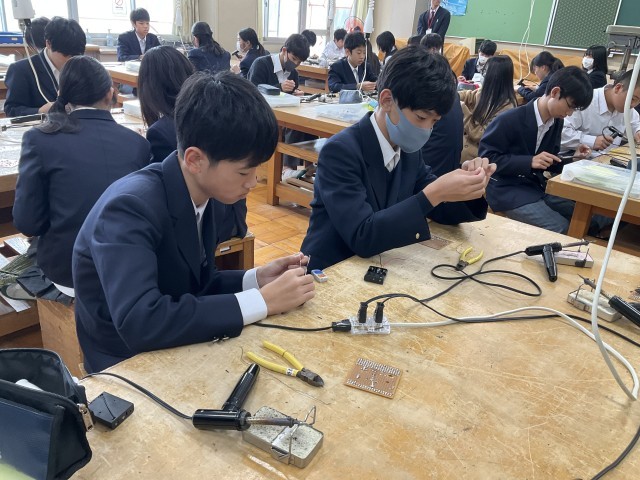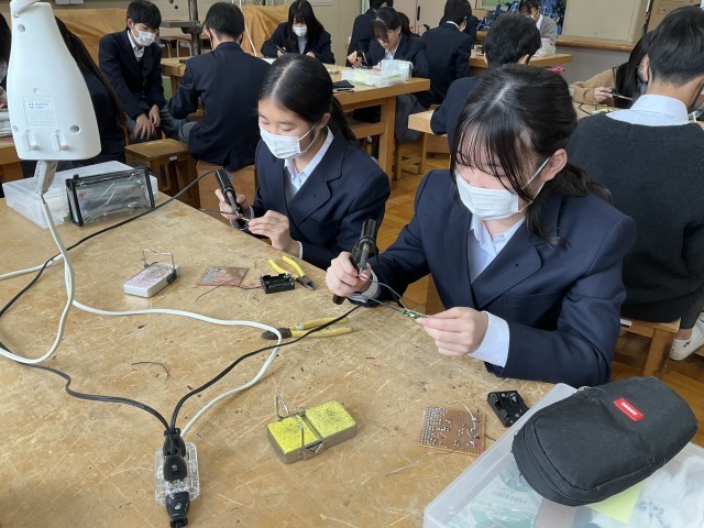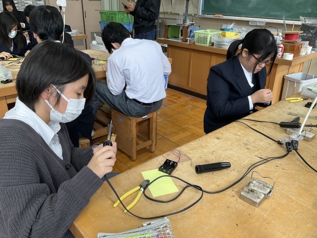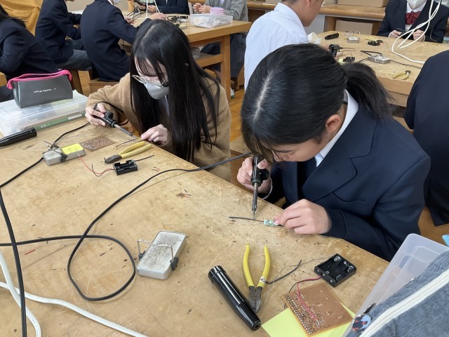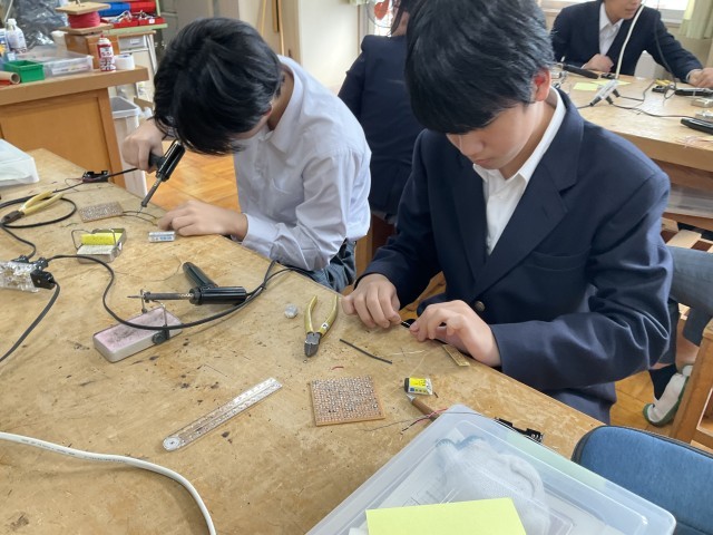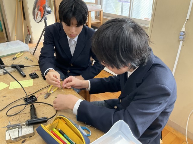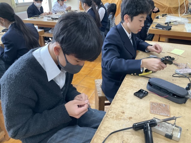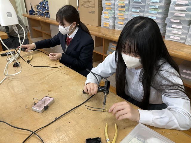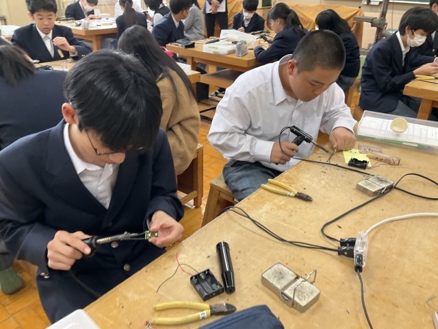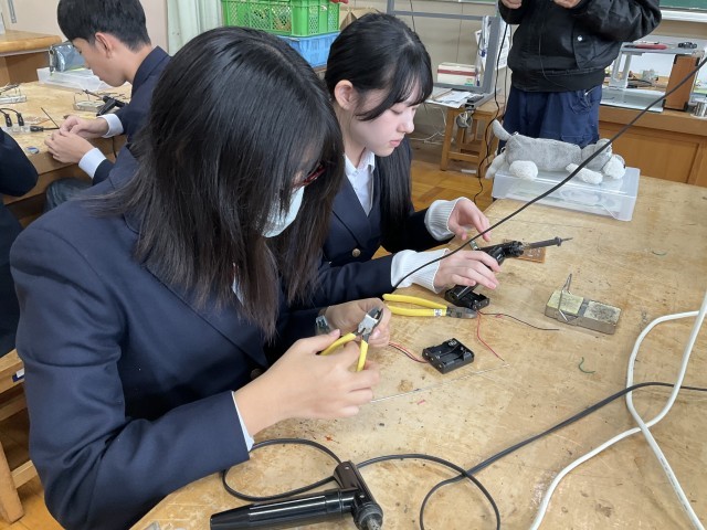 コードに巻かれているビニールをはんだごてで温めています。