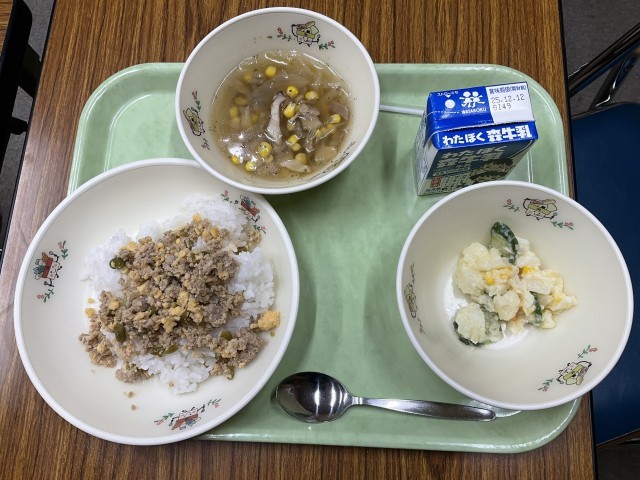 三色そぼろ丼、ポテトサラダ、玉ねぎとコーンのスープ、牛乳 です。