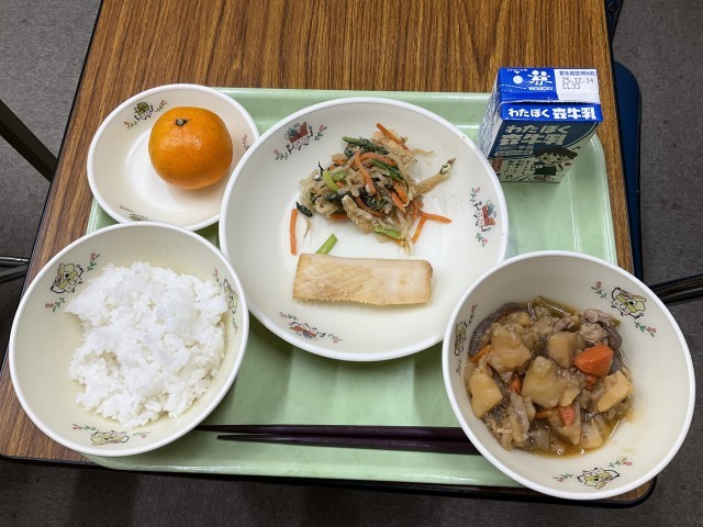 いかの香味焼き、野菜と油揚げのごま和え、肉じゃが、ごはん、みかん、牛乳 です。