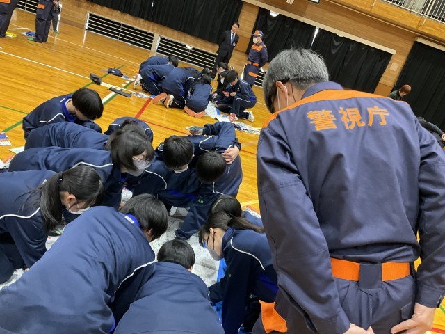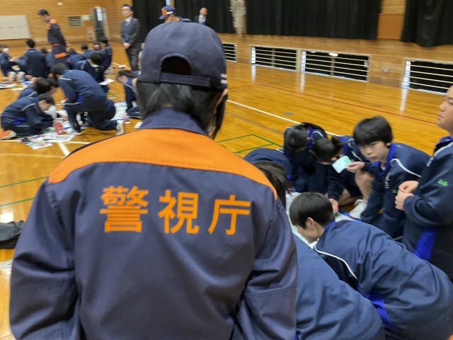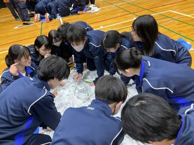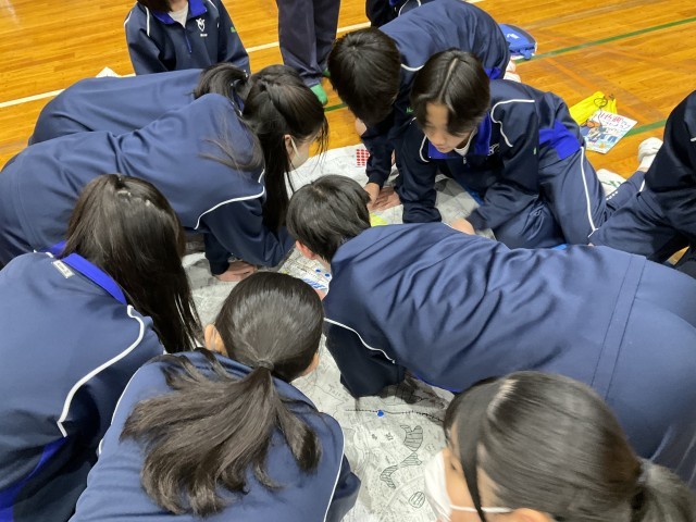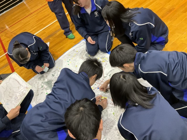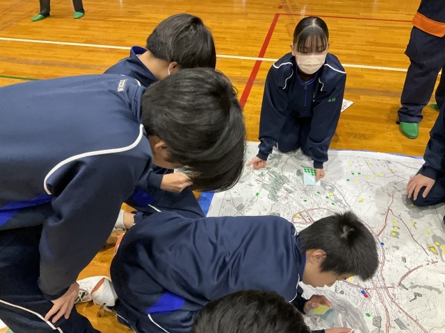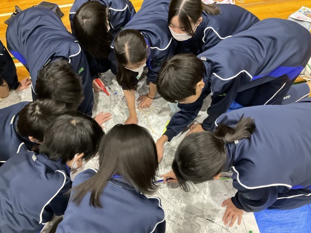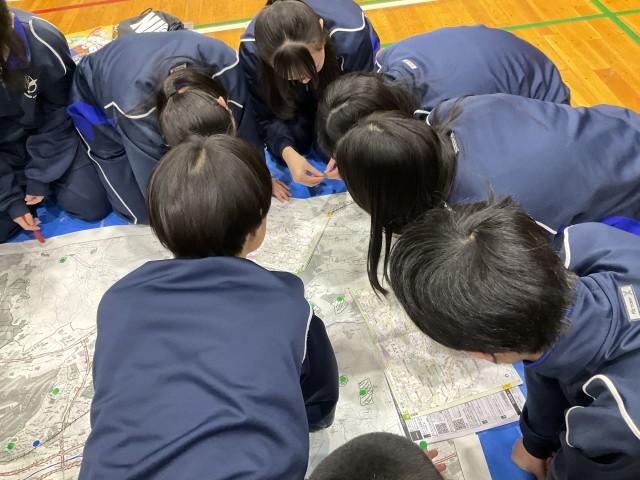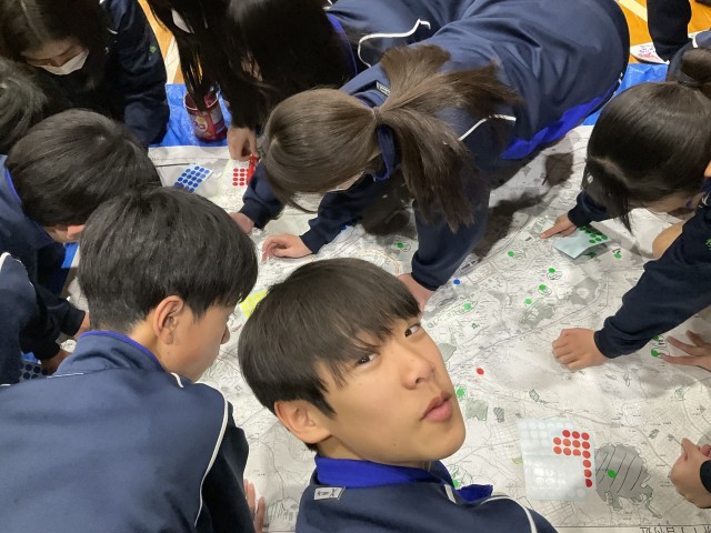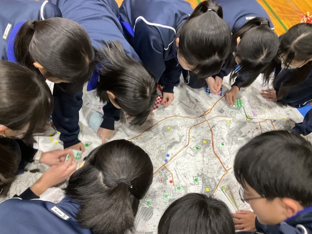 大きな地図を囲んで、指示された課題に取り組んでいます。
