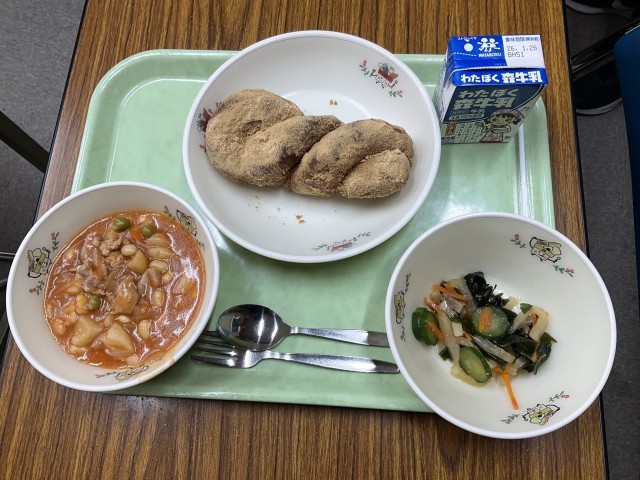 チキンビーンズ、大根とわかめのサラダ、きなこあげパン、牛乳 です。