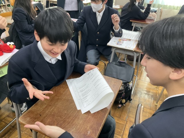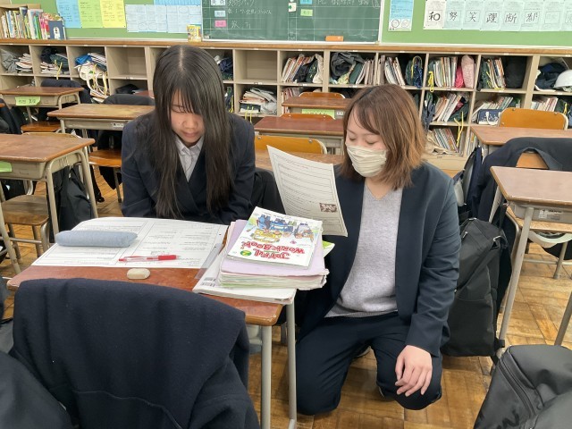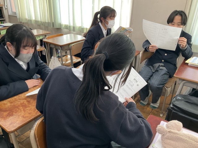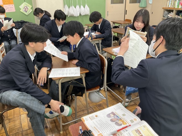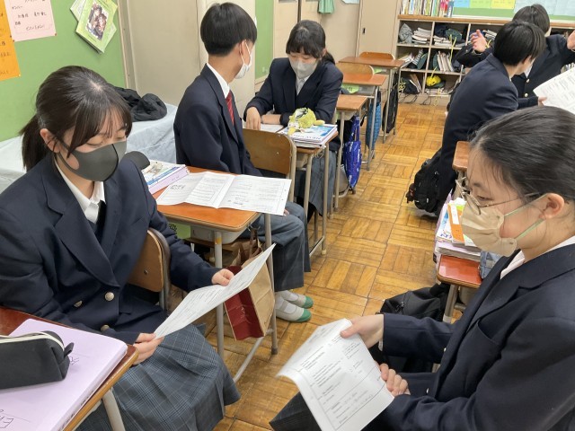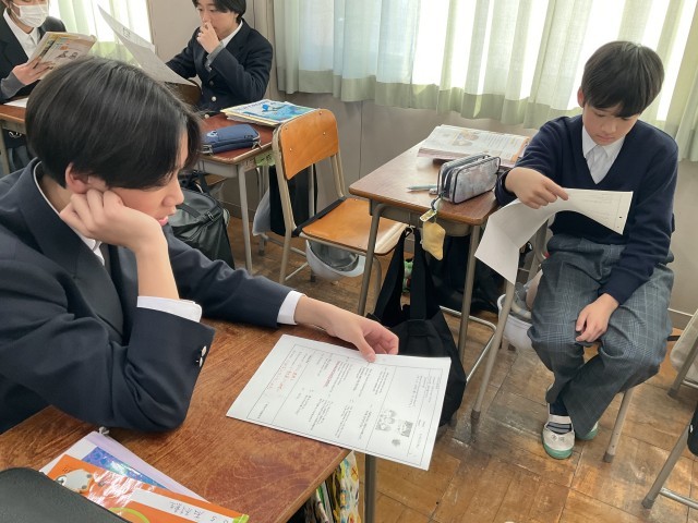 本文の音読練習と意味の確認をペアで行っています。