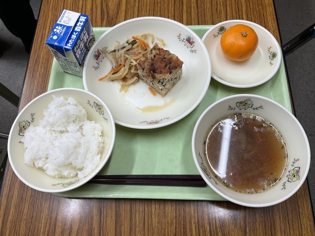 ひじきと豆腐のハンバーグ、和風サラダ、オニオンスープ、ごはん、みかん、牛乳 です。