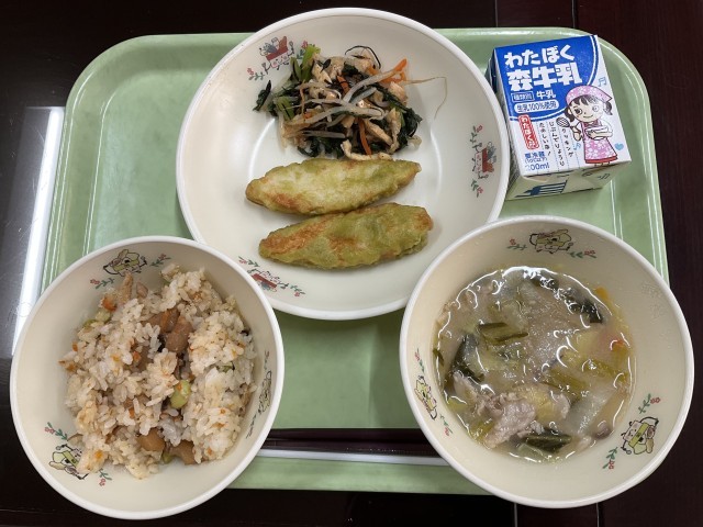 桑都揚げ、定式幕和え、八王汁、かてめし、牛乳 です。