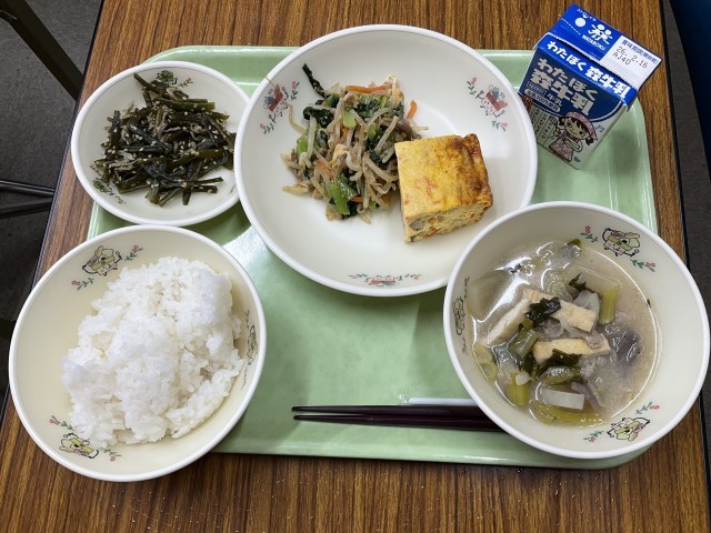 厚焼き卵、ごま和え、八王子産米の粕汁、くきわかめのじゃこ炒め、ごはん、牛乳 です。