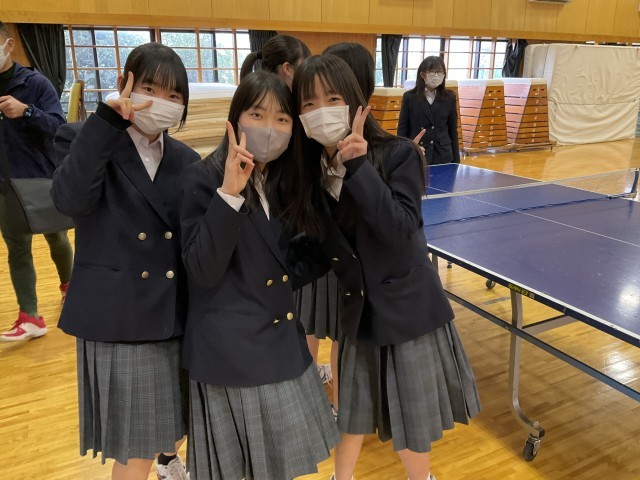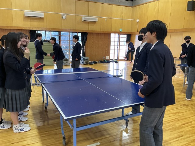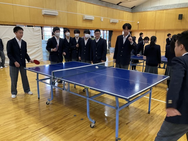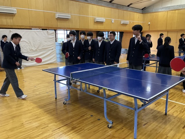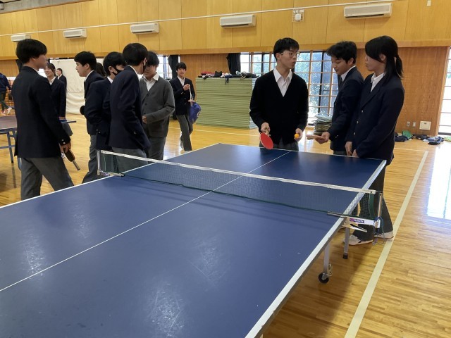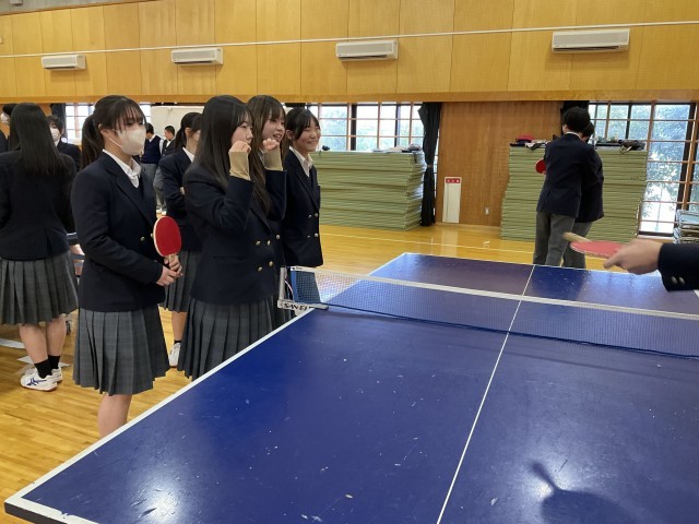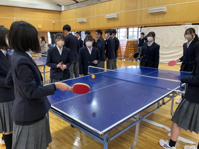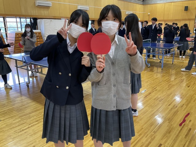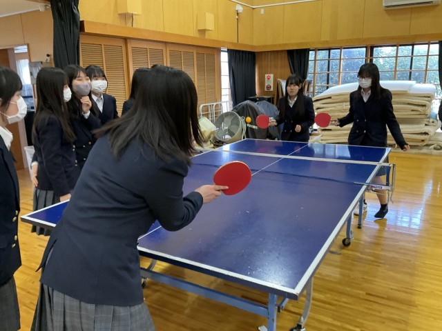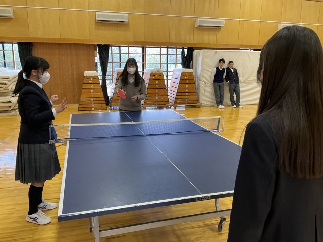 体育着を持っていないため、標準服で卓球をしています。