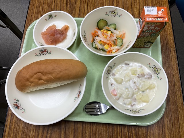 クリームシチュー、大根のフレンチサラダ、手作りりんごジャム、国産小麦パン、オレンジジュース です。