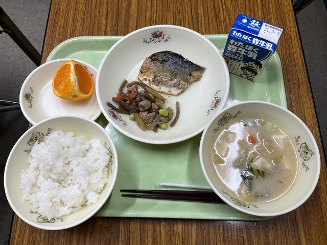 鯖のごま風味焼き、東京うどの炒め煮、チンゲン菜と豆腐のみそ汁、果物、牛乳 です。