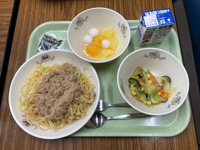 はち大根おろしスパゲティ、野菜とじゃこのサラダ、フルーツ白玉、牛乳 です。
