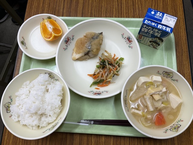 鯖のおろしソース、野菜のおかか和え、呉汁、ごはん、でこぽん、牛乳 です。