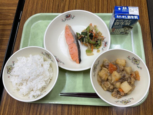 鮭の塩焼き、小松菜と白菜のおかか和え、ピリ辛肉じゃが、ごはん、牛乳 です。