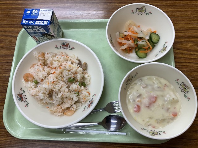 エビピラフ、白菜のクリーム煮、大根のフレンチサラダ、牛乳 です。