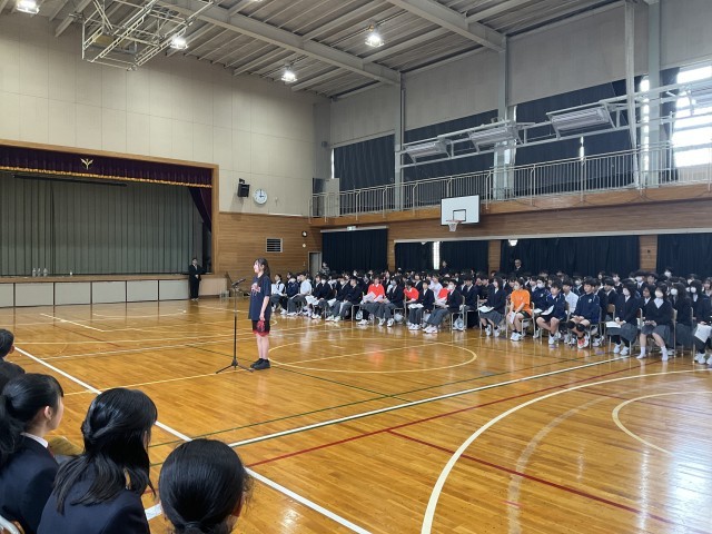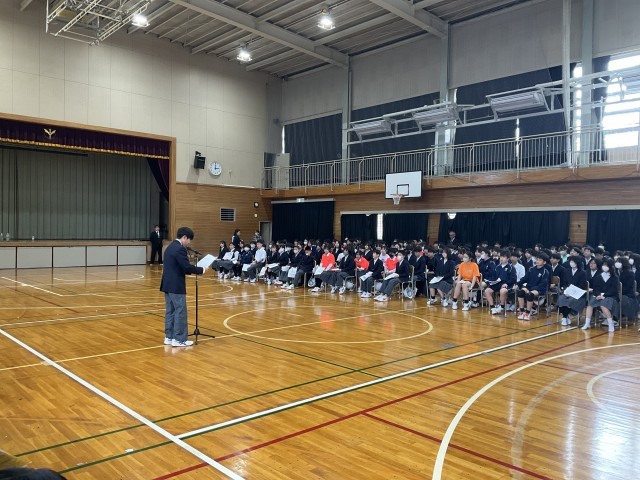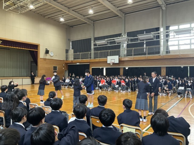 花の贈呈、新入生のお礼の言葉、終わりの言葉の様子です。