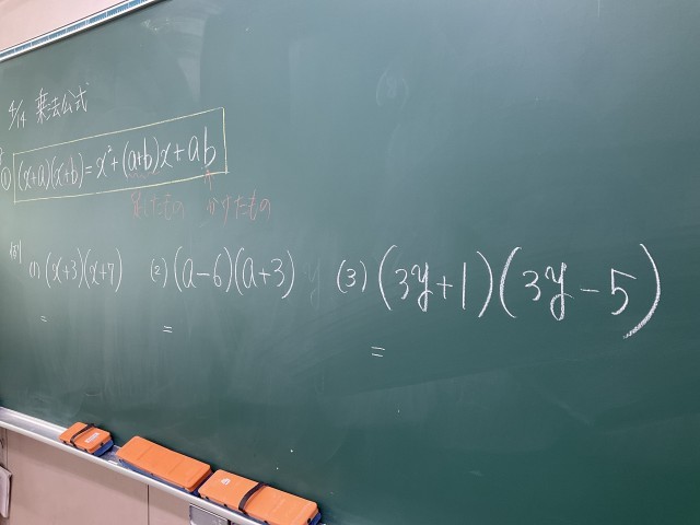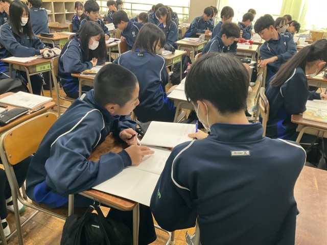 黒板に提示された例題に取り組み、答えを確認しています。