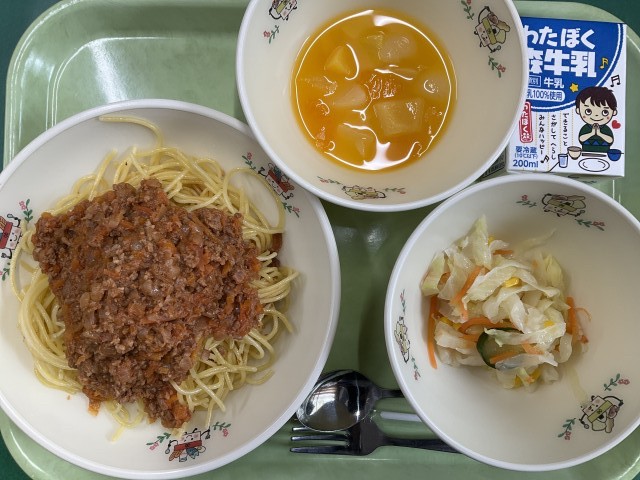 スパゲッティミートソース、フレンチサラダ、オレンジポンチ、牛乳