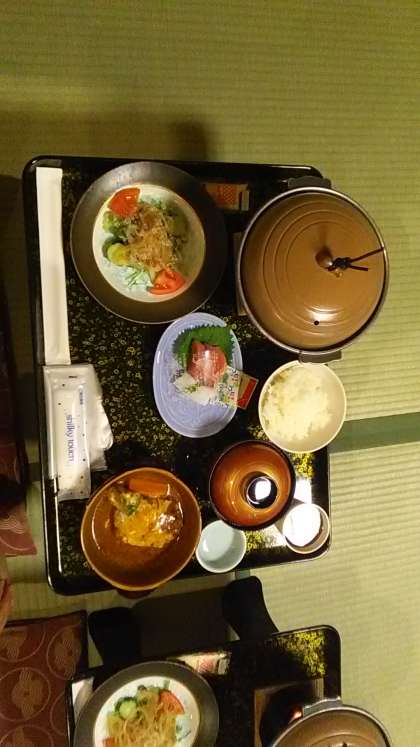 1日目の夕食です。お刺身や煮込みハンバーグなど美味しいメニューです。