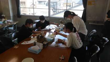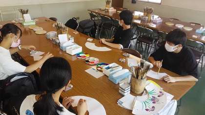 班行動の中で体験学習に取り組む班もあります。こちらは、京扇子の絵付けに挑戦しています。世界に一つしかない扇子ができあがります。